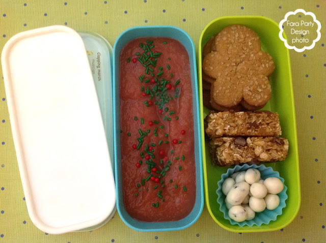 Galletas de jengibre, barra de granola, pasas cubiertos de yogur, puré de manzana y fresas.
