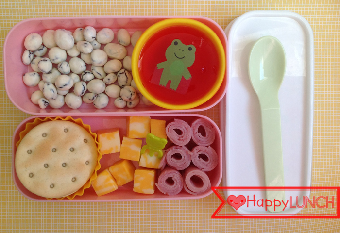 Galletas de sodas redondas, cuadros de queso pinto adornados con un sapito, rollitos de jamón, gelatina de fresa con barán de sapo y pasas cubiertas de yogur.